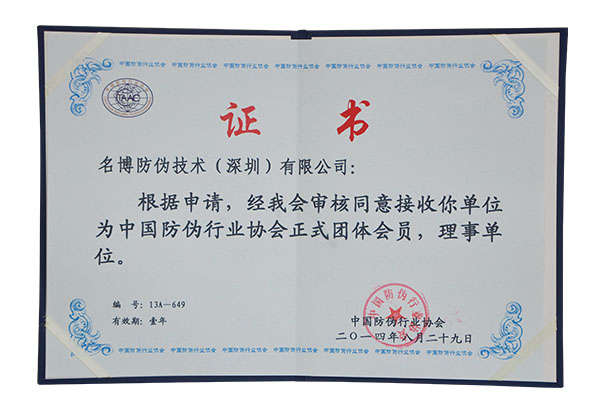 名博公司于1993年成立,是亞太防偽協會會員、中國防偽協會理事單位。公司集研發、生產、銷售為一體,專業提供各種防偽油墨、防偽材料、防偽制品,是中國知名防偽產品制造商之一。